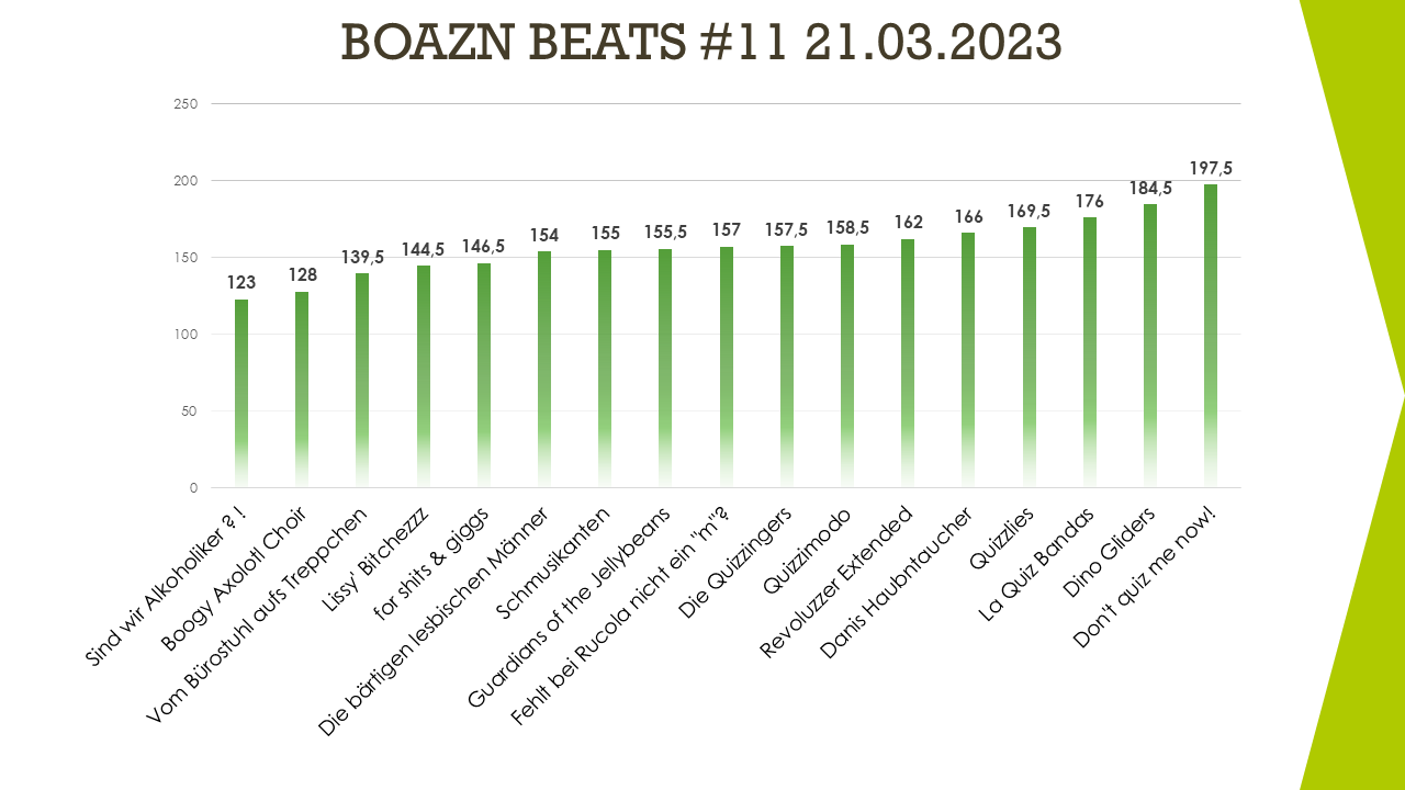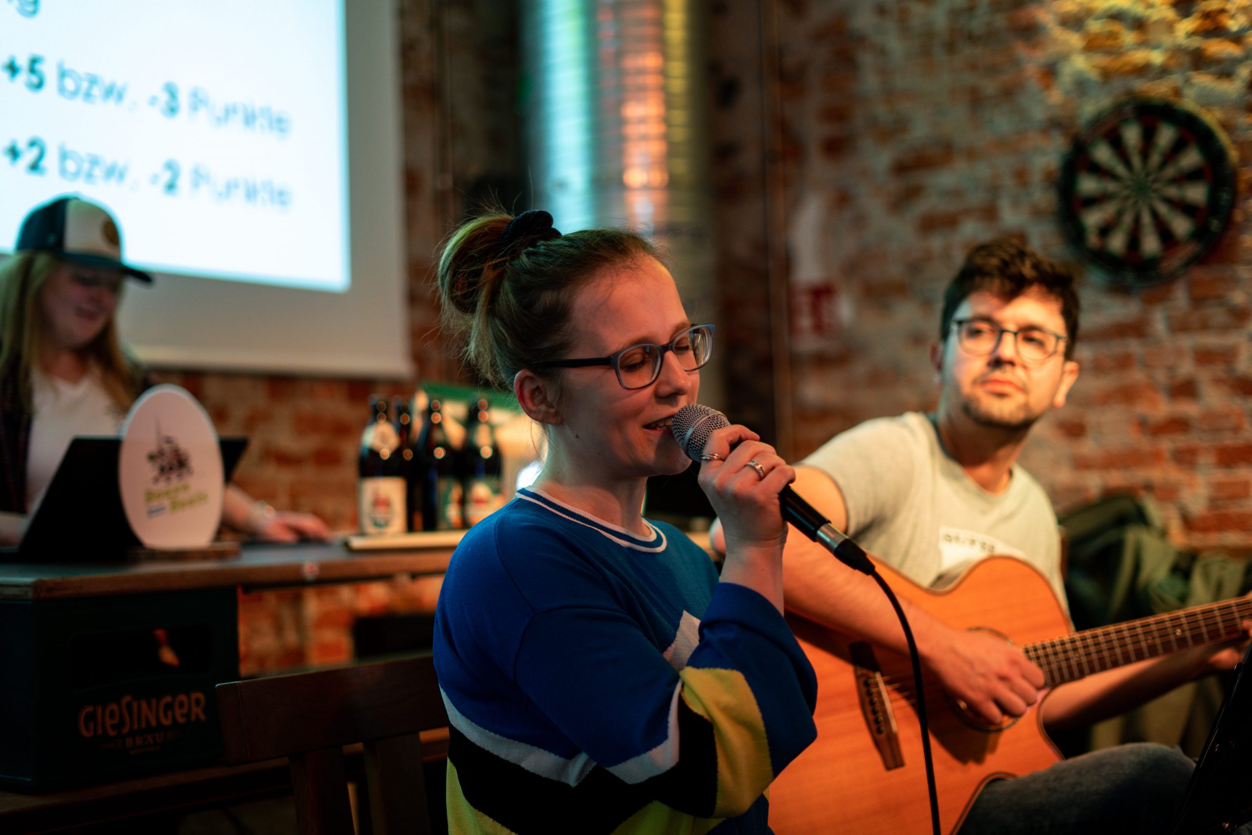 Das Quiz hatte einige Highlights: Angefangen mit der Warm-up Runde vom Team „Don’t quiz me now“, über die lang geplante Mashup-Runde, die Oscar- und Film-Runde bis hin zum Live-Music-Special mit Gesi & Julian, die uns eine grandiose „Beer you, Beer me“ Runde präsentiert haben.