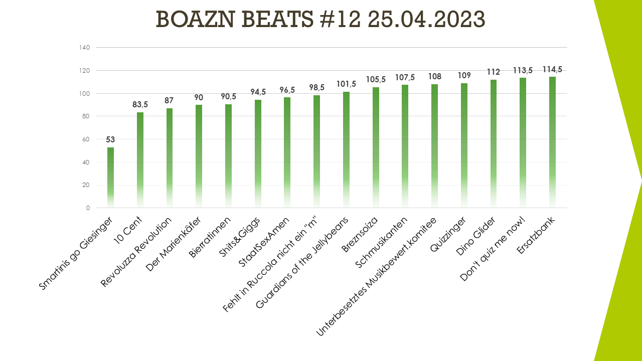Ostern war zwar schon rum, trotzdem gab’s beim 12. Quiz ein paar musikalische Ostereier, sprich Samples, die in Songs versteckt waren. Außerdem musste endlich mal den Drummern dieser Welt Tribut gezollt werden: Anlässlich des World Drummer’s Day am 4. April gab’s ein Runde mit Drumintros. Beim Finale sollte „Mut zur Lücke“ bewiesen werden. Ihr habt die Lyrics kräftig mitgesungen und damit ganz im Sinne von Fair Play auch die Lösungen mit den anderen Teams geteilt.