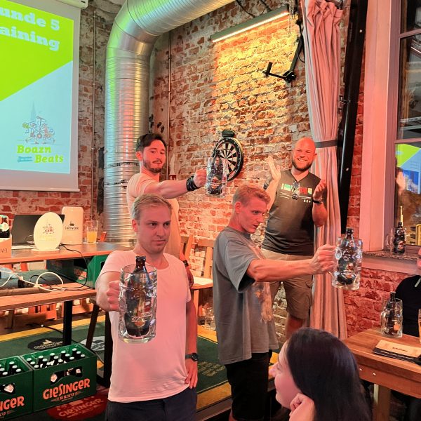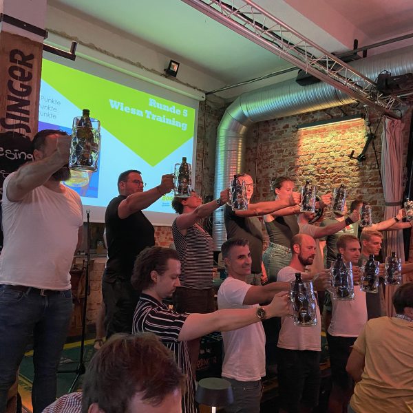 Ordentlich aufgewärmt von der Brass-Runde ging es weiter zum Maßkrug-Stemmen. Je ein Teammitglied durfte die Muskeln spielen lassen für satte extra Punkte. Angefeuert vom Publikum in bester Cheerleader-Manier haben sich alle ganz hervorragend geschlagen. Die Bestzeit lag bei stolzen 4:35 Minuten – Respekt!