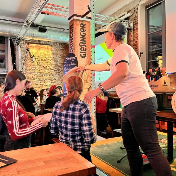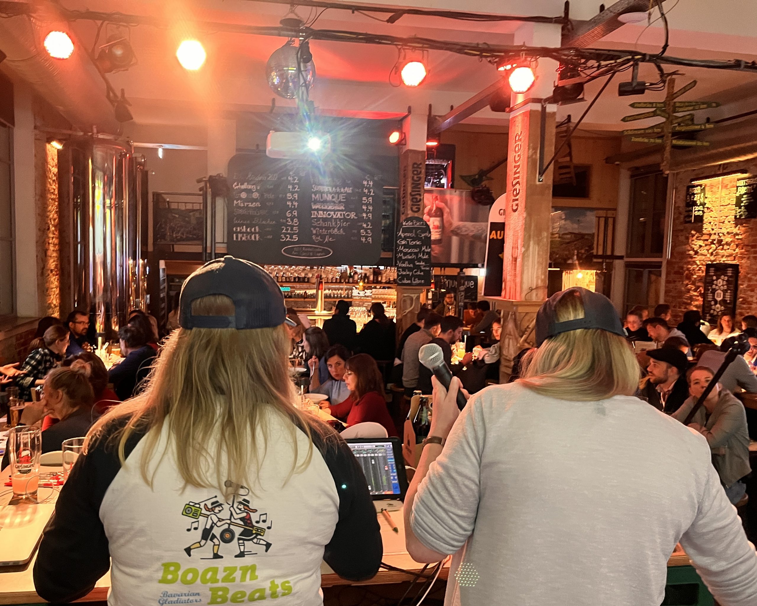 Nicht so leicht zu erraten war die Bierrunde „Wie basst des zam?“, bei der die Songs oder Künstler:innen eine Verbindung haben. Punkte und Bier gab’s für die richtige Antwort „Kater“, die erst beim 7. Song und nach Tippgeber Taio Cruz mit „Hangover“ erraten wurde.