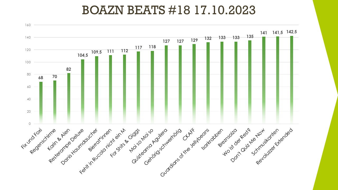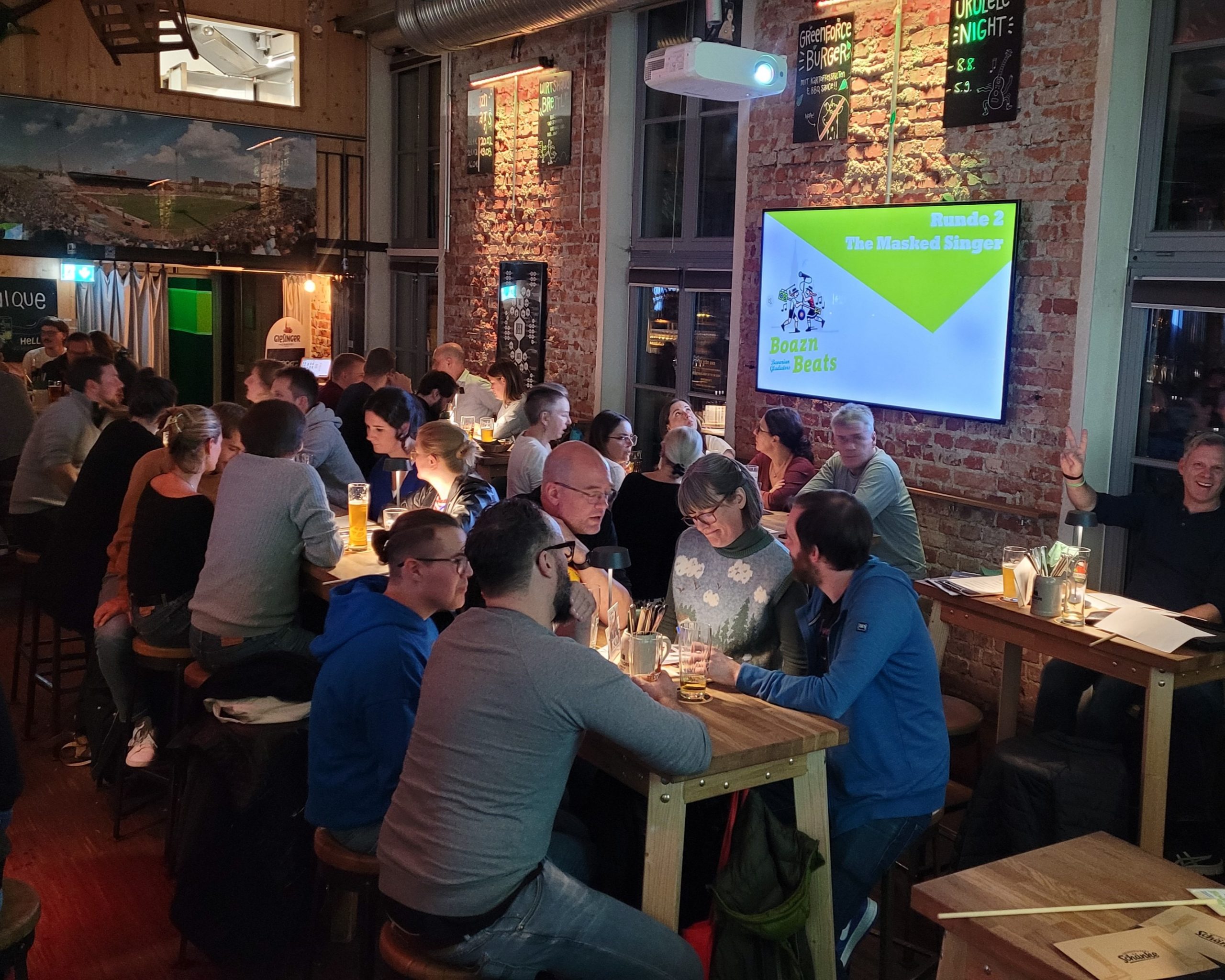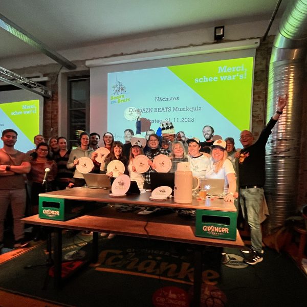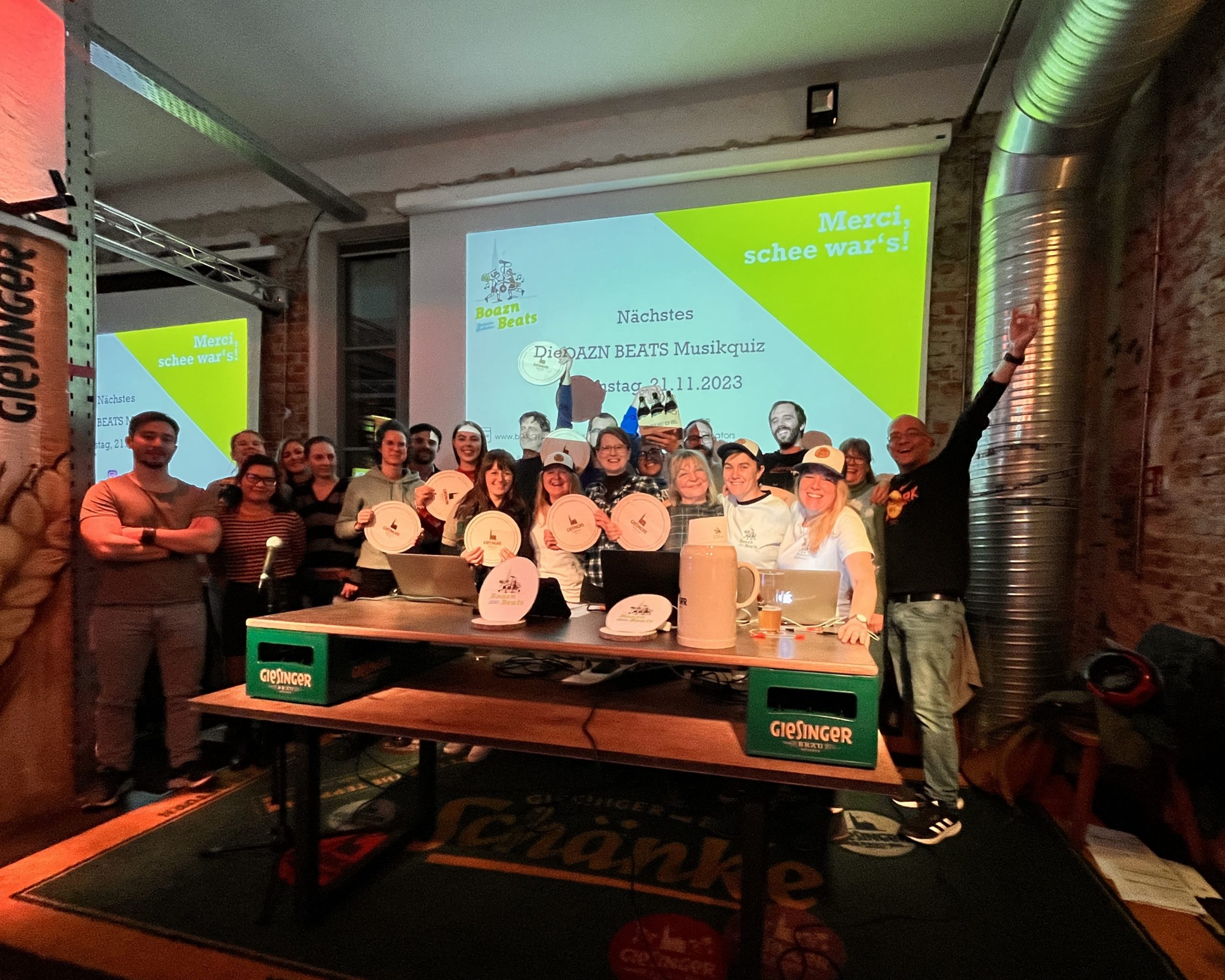 Bei der 18. BOAZN BEATS Ausgabe im Oktober war die Schänke wieder bumsvoll! 18 Teams haben um fantastische Preise gequizzt: Bier & Brotzeit-Brettel von Giesinger Bräu! Und es war mal wieder sehr eng auf den ersten Plätzen.