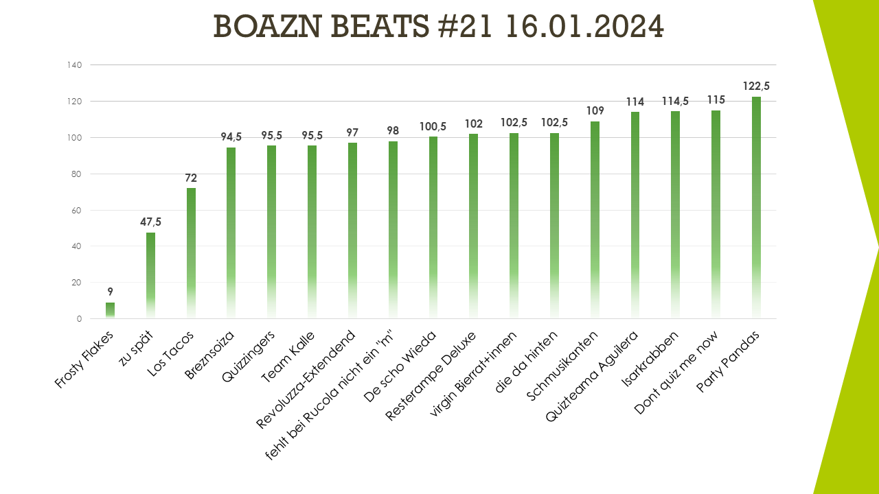 Am Schluss gab’s noch ein Stechen um Platz 3: Die Isarkrabben hatten „The Clash“ in 2 Sekunden erkannt und zogen dadurch ganz knapp an „Quizteama Aguilera“ vorbei.