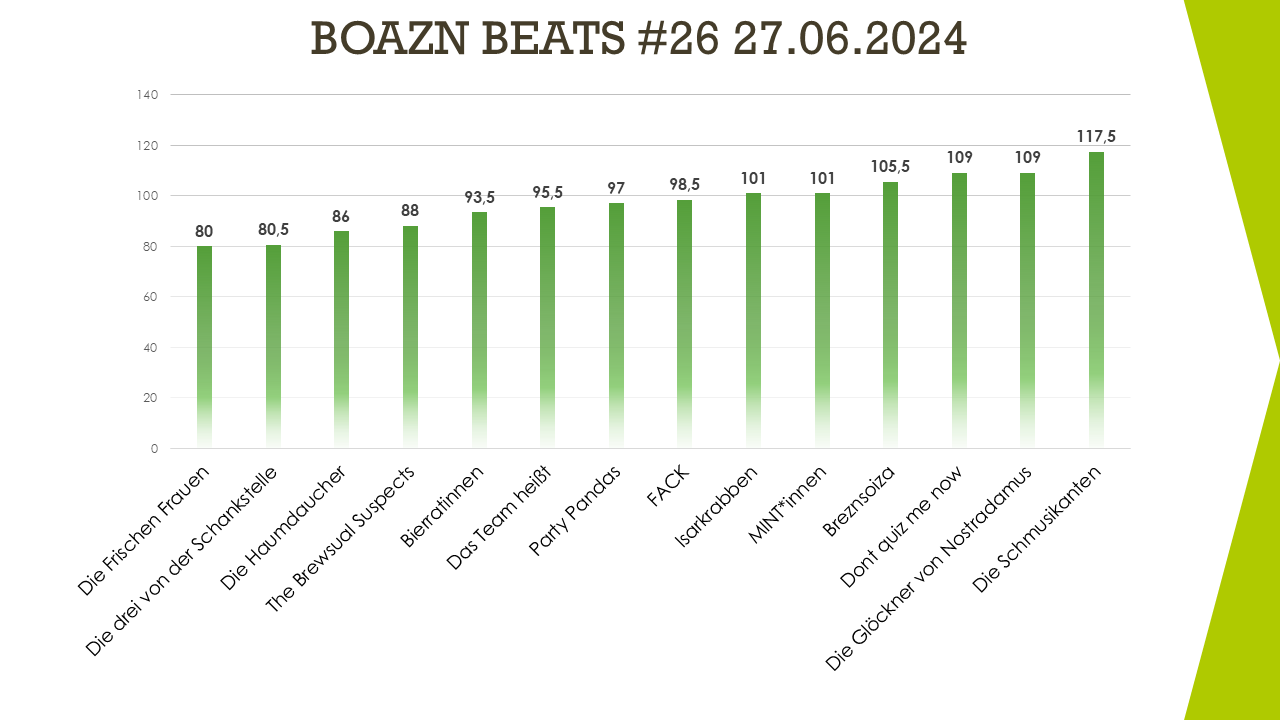 Die 26. Ausgabe des BOAZN BEATS Musikquiz war das erste echte Sommerquiz des Jahres mit gefühlten 37°C in der Schänke. 14 fantastische Teams – darunter viele neue Quizzlies – haben sich mit uns sous-vide durch den Abend gequizzt! Der wichtigste Player war sicher unser Ventilator!