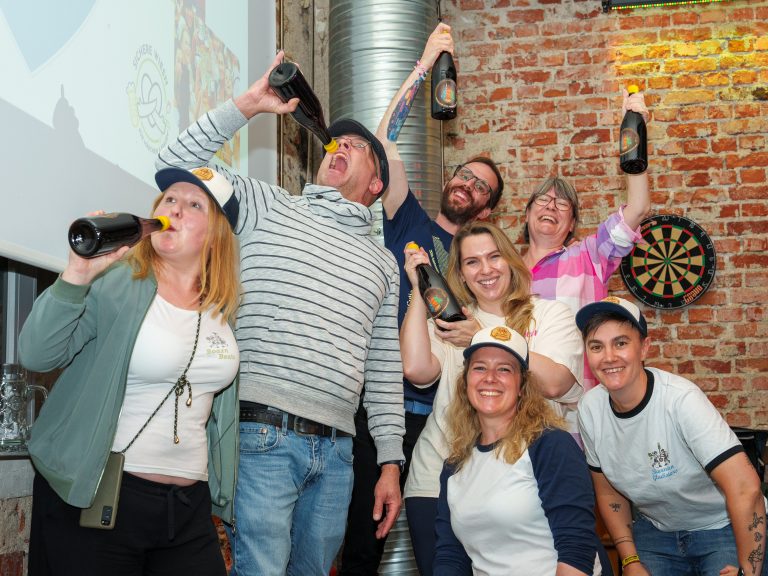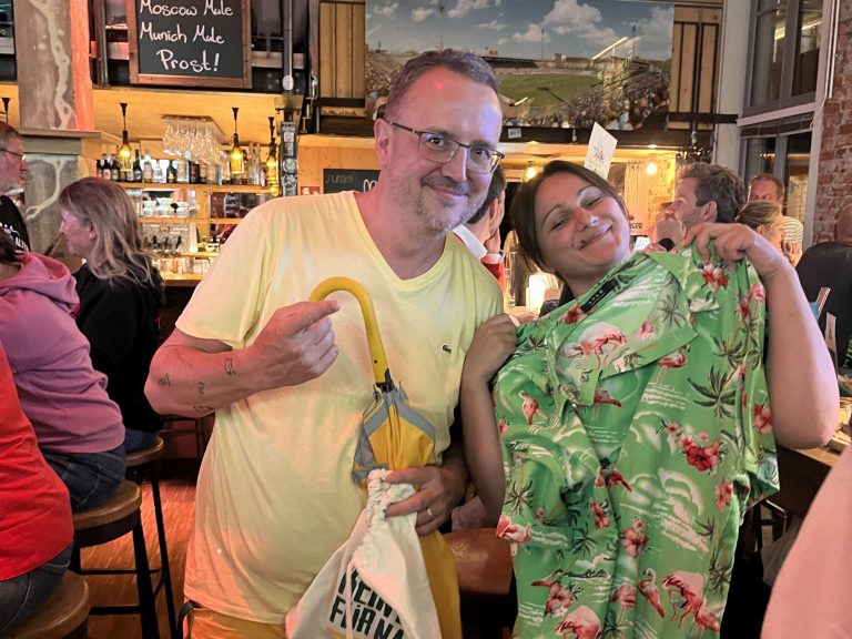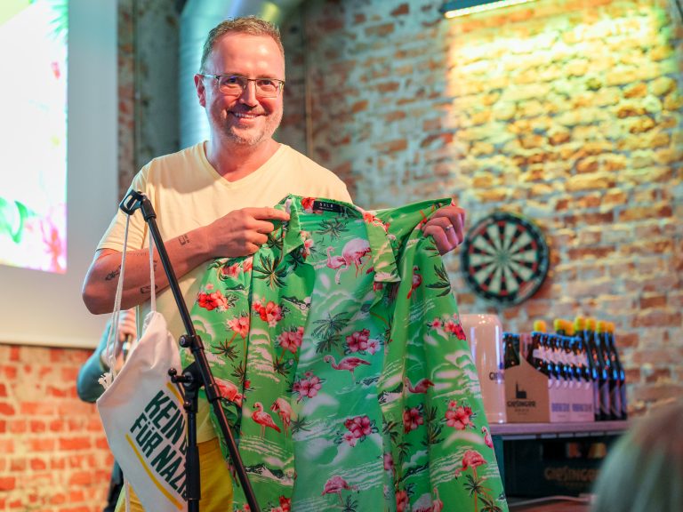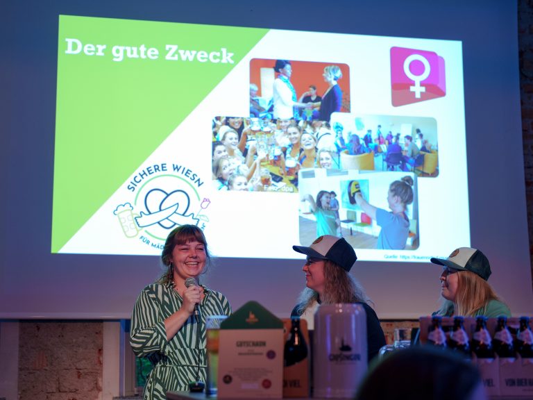 Unser Spendenzweck war der Frauennotruf München, die Beratungsstelle für Mädchen und Frauen und Mitinitiatoren der „Sicheren Wiesn für Frauen“. Für diese wichtige Organisation kam ein ordentliches Spendensümmchen zusammen: Ganze 458 €, die von Giesinger Bräu nochmal großzügig auf 1.000 € aufgerundet wurden. Um die Spendensumme noch weiter hoch zu schrauben, gab der Chef, Steffen Marx, außerdem sein letzter (Hawai-)Hemd. Die Gebote gingen schnell auf über 50 €hoch und Jasmin aus Kanada bekam den Zuschlag für 100 €! Bäm!