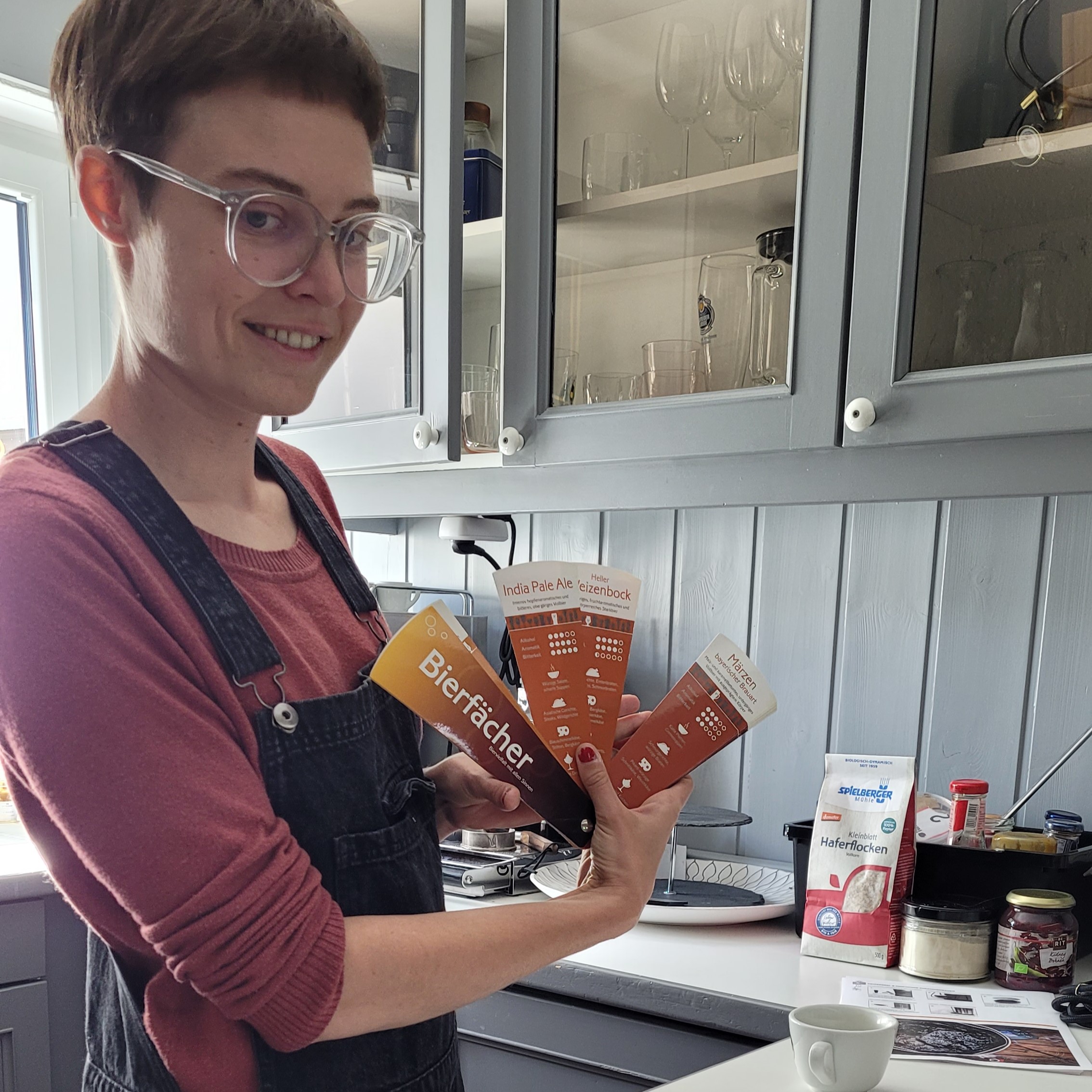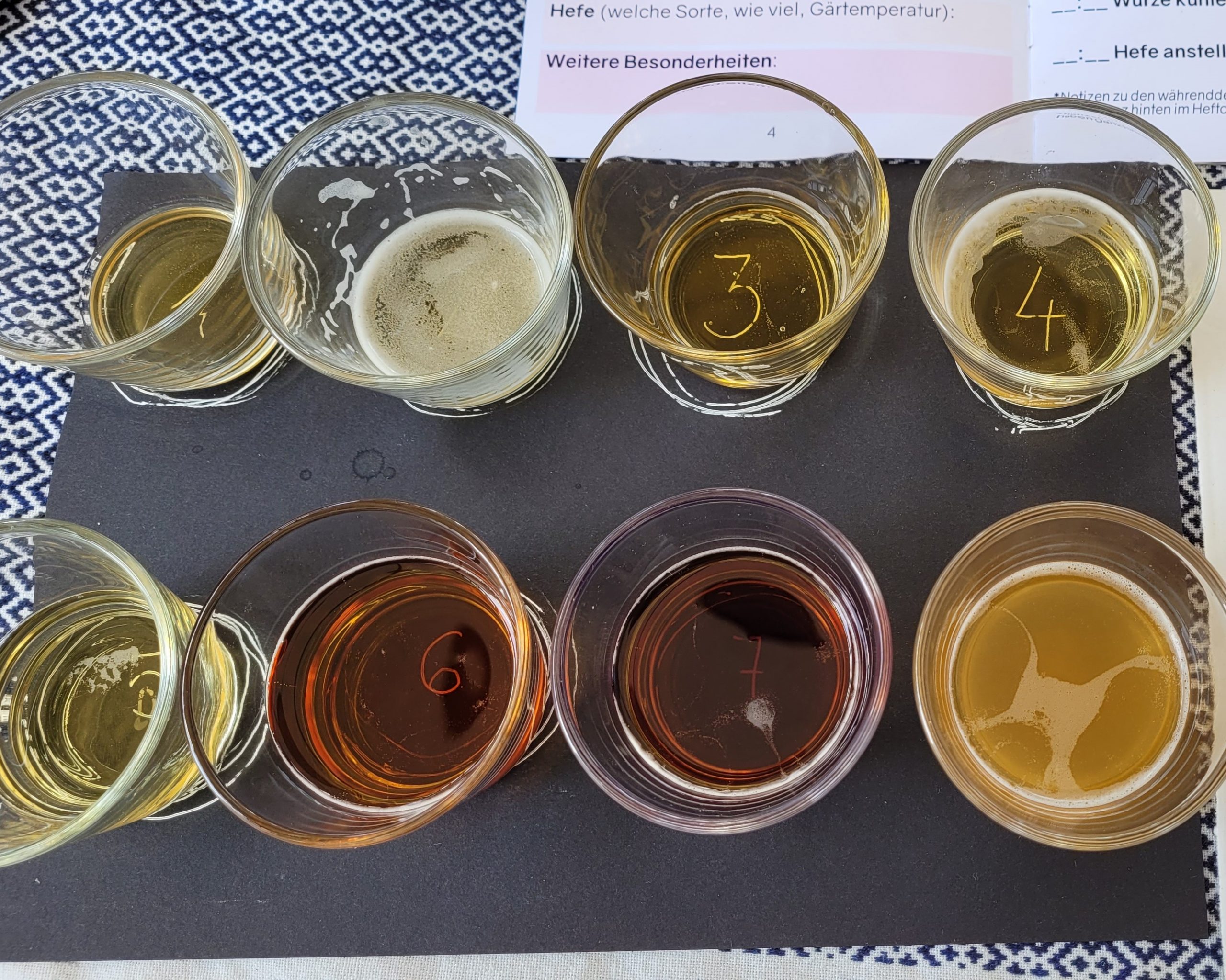 Und damit die Phasen zwischen den verschiedenen Bierbrausteps sinnvoll gefüllt wurden, haben wir noch eine Blindverkostung von 7 bayerischen Bieren gemacht. Biersommelière Clarissa hatte verschiedene Köstlichkeiten dabei, bei denen wir in der Einschätzung teilweise sauber daneben lagen. Überraschungsfavorit bei der Blindverkostung: Ein Doppelbock von Schneider Weisse.